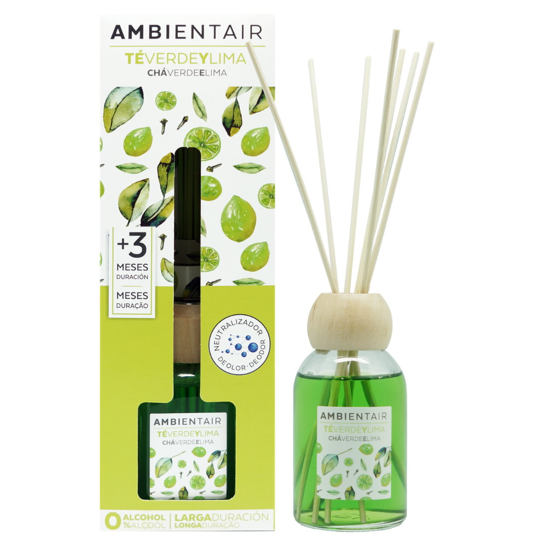Enjoy a continuous sensation of freshness with the wand diffuser. Ambientair Classic aroma Green Tea and Lime. This fragrance combines the serenity of green tea with the sparkling and revitalizing touch of lime, in a harmonious blend that balances the best of the Orient and the Mediterranean.