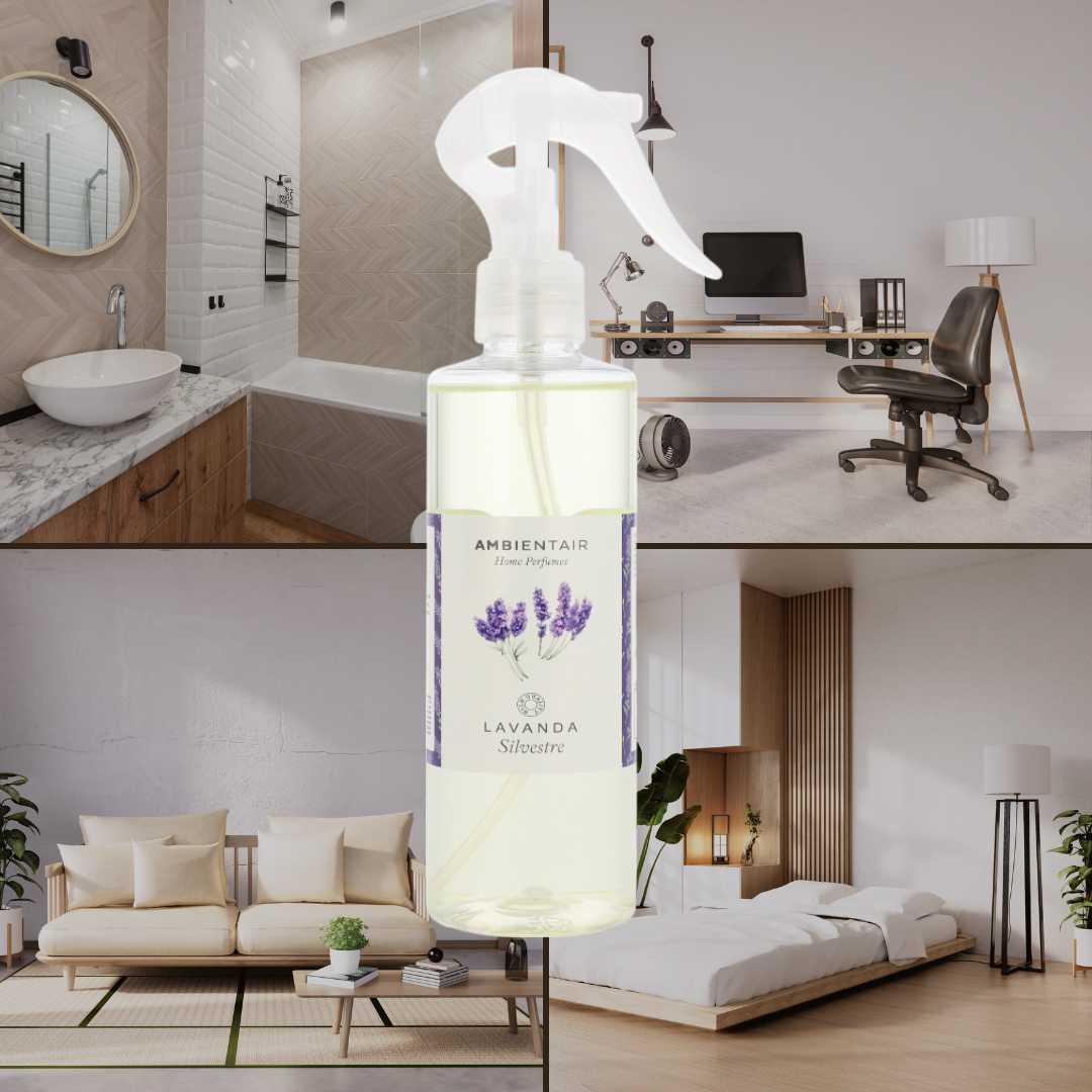 Immerse yourself in the tranquility of the scented fields with Ambientair's Wild Lavender spray. An ancestral fragrance that evokes calm and restful sleep, perfect for those seeking peace and relaxation in their home. Fresh top notes of mint, lavender and eucalyptus combine with an aromatic heart of pine, jasmine and lily of the valley, while a warm base of amber, patchouli and tonka bean gently envelops the atmosphere.