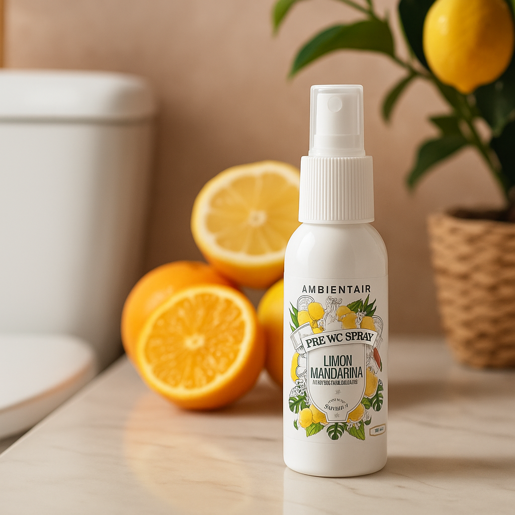 The Pre-WC Spray Lemon Tangerine from AMBIENTAIR transform your bath routine with a fresh, citrusy touch that changes everything. This innovative fragrance is designed to be used formerly toileting, creating a barrier in the water that traps and neutralizes bad odors. formerly of their appearance.