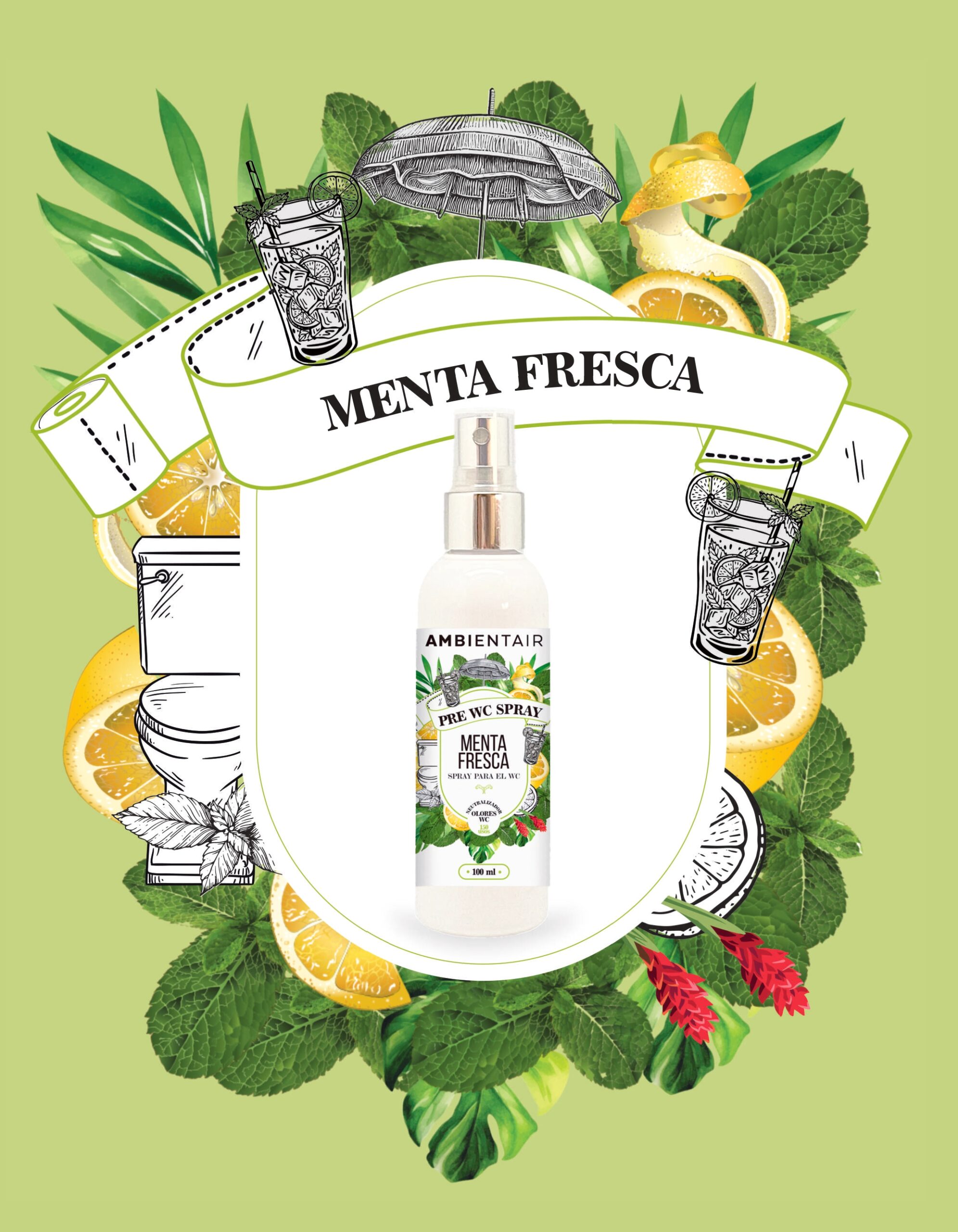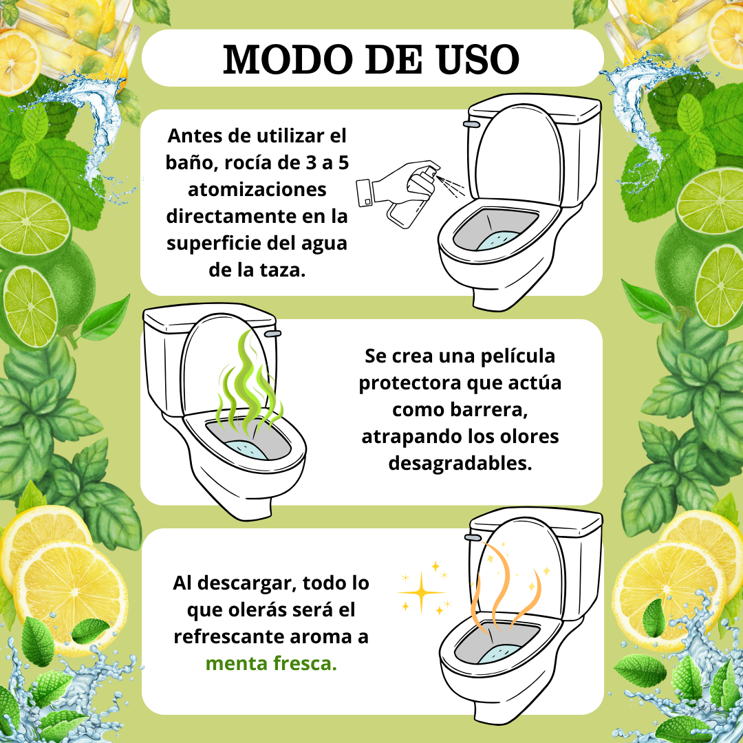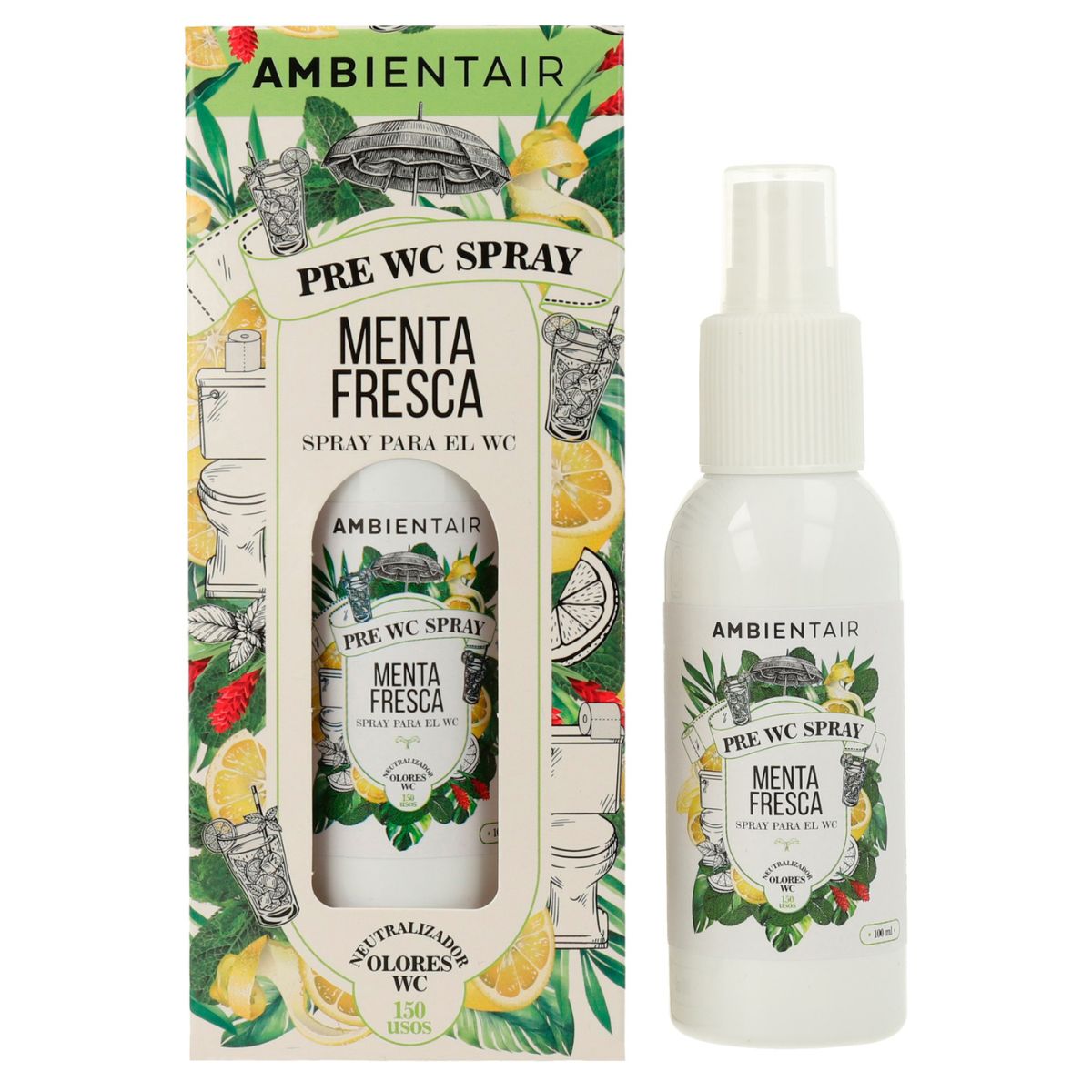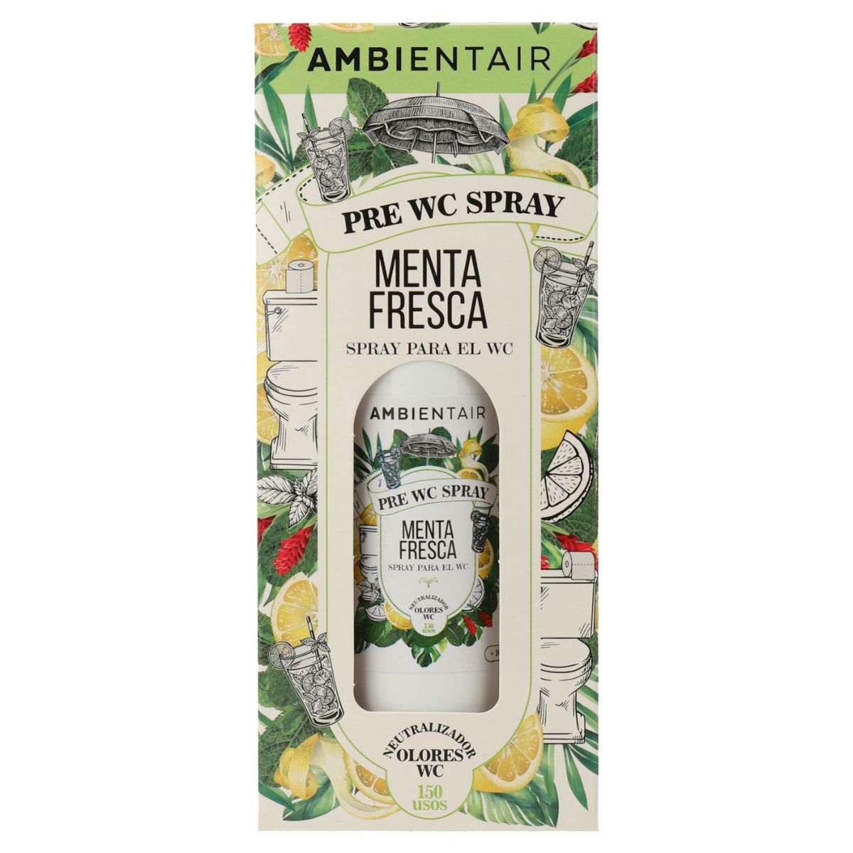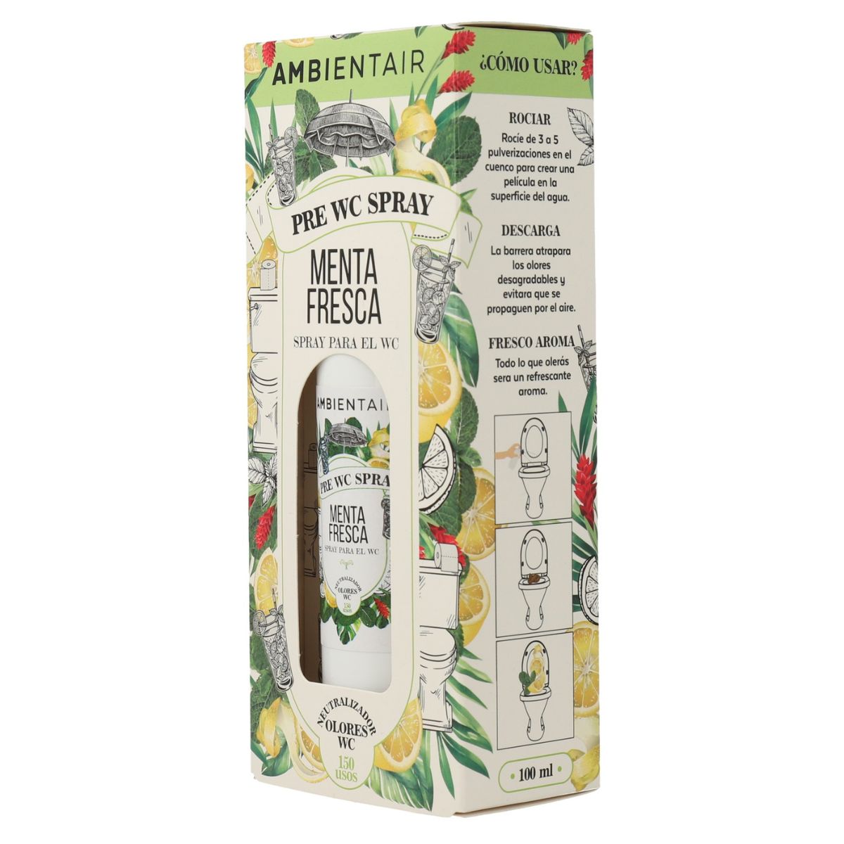 Give an ultra-fresh twist to your bathing routine with the Pre-WC Fresh Mint Spray from AMBIENTAIR. This powerful fragrance was designed to be used before going to the bathroom: when sprayed over the toilet water, it creates a barrier that traps odors and releases an intense, natural minty fragrance.