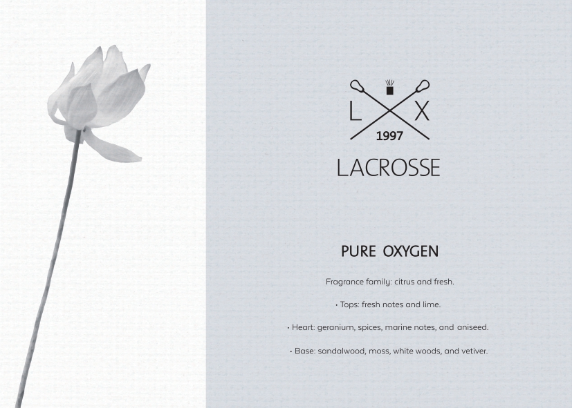 Feel the atmosphere instantly refreshed with Lacrosse Pure Oxygen home spray. Its fresh, aquatic scent, with hints of lime, geranium, anise and white woods, evokes the feeling of a clean breeze wafting through open spaces. It is perfect for mentally airing out a room, revitalizing the mood or bringing balance after a long day.