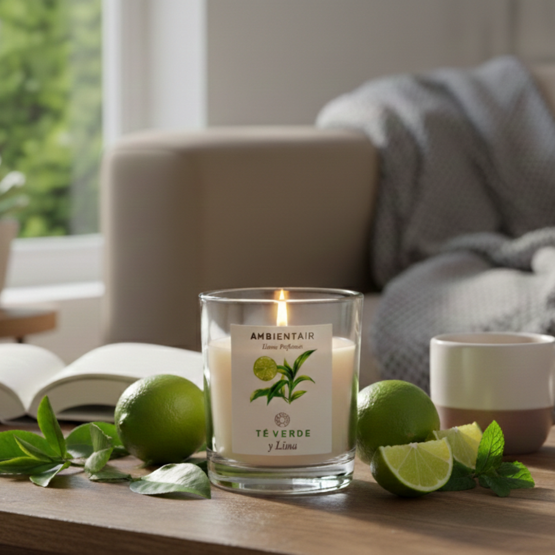 Revitalize your spaces with the scented candle Green Tea and Lime by Ambientair Home Perfumes, a fresh and sparkling fragrance that brings energy and well-being to the environment. Its clean and fun combination of lime, lemon, eucalyptus and menthol freshens the air, while the heart of green tea, litsea, mandarin and lavender gives it a balanced and delicate touch. The amber base adds warmth without losing the fresh and vibrant feeling.