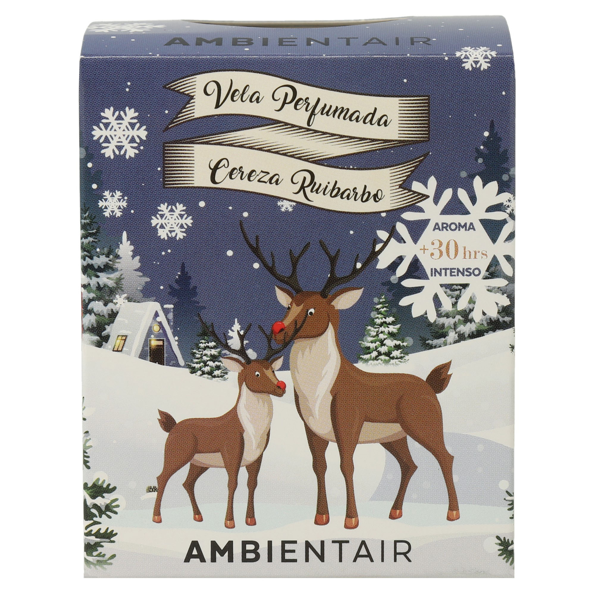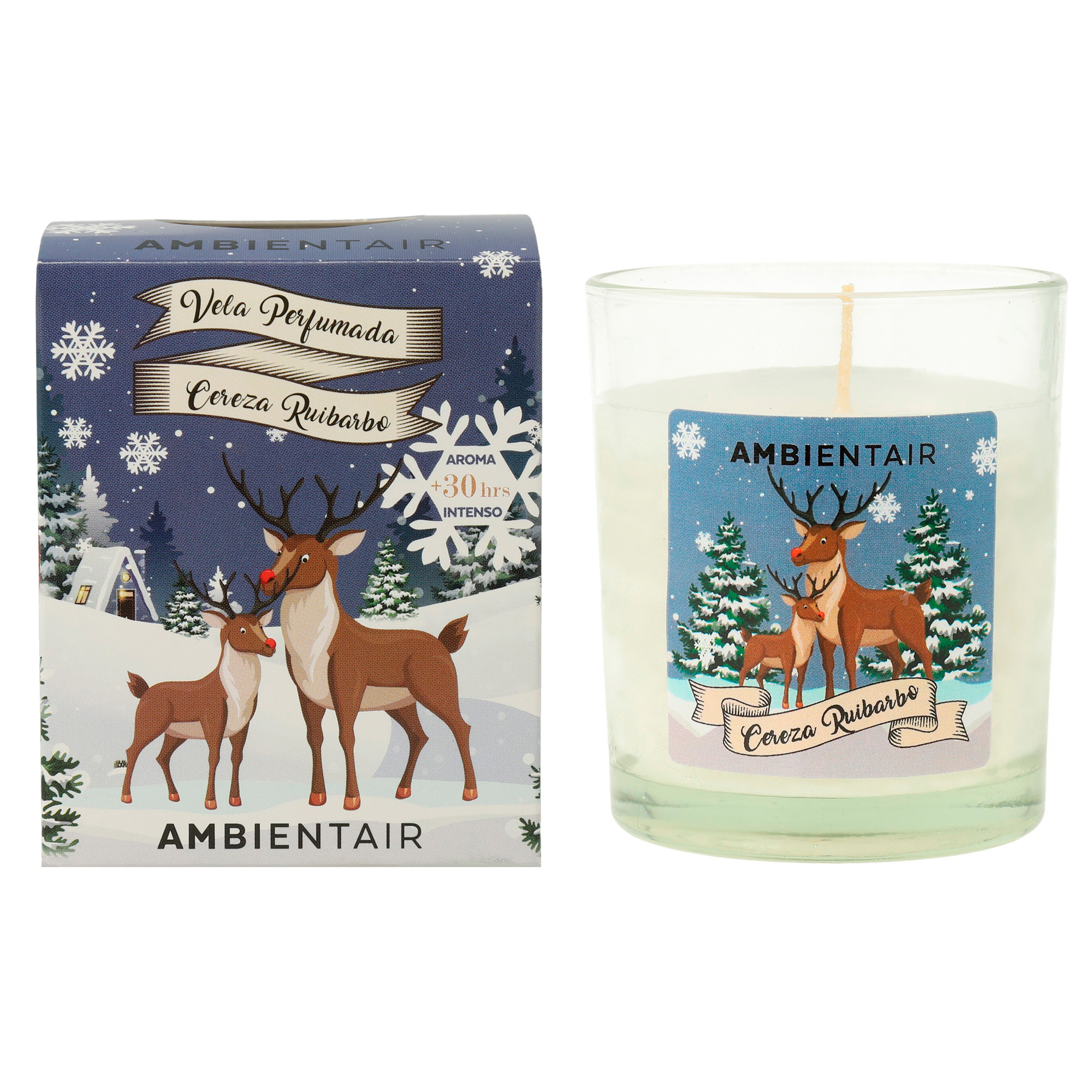 Bring freshness and Christmas sweetness with the scent of cherry and rhubarb. A candle decorated with reindeer that illuminates and perfumes your home.